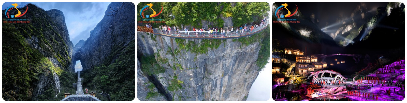 • “Đại Hiệp Cốc” hay còn gọi “Cầu Pha Lê” Cây cầu đáy kính nổi tiếng này rộng 6m, dài 430m, bắc qua 2 vách đá ở độ cao 300m và nhìn xuống công viên Trương Gia Giới, được xem là cây cầu cao và dài nhất thế giới (Bao gồm vé cầu kính).