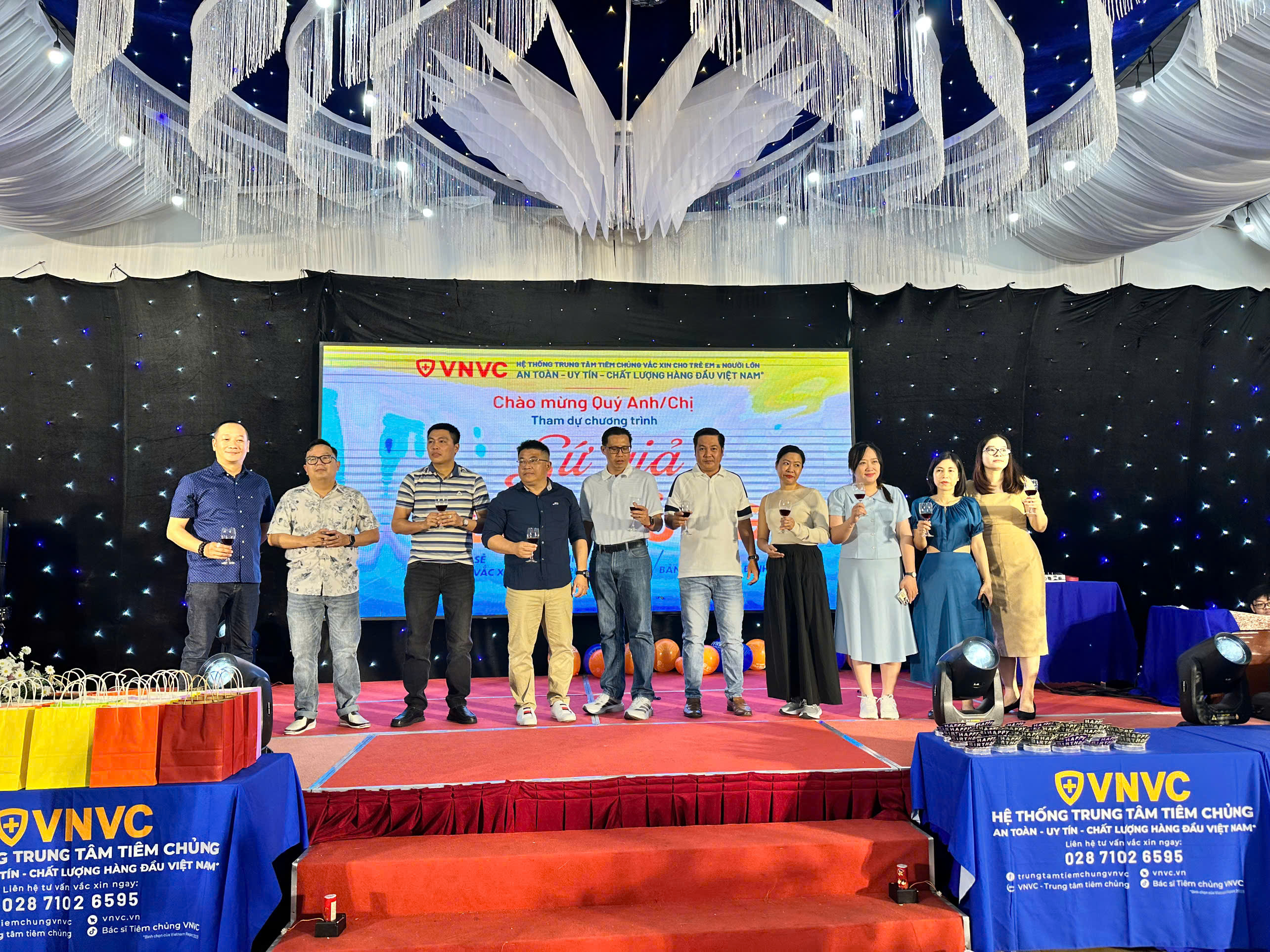 Thực đơn thêm 200.000đ/suất, Âm thanh công suất lớn, Ánh sáng sân khấu, Thiết kế Màn hình Led, Nhóm nhảy mở màn, DJ nữ đẹp, MC, Nhân sự, rượu khai tiệc, quà tặng: dù + balo du lịch, trò chơi sân khấu |
